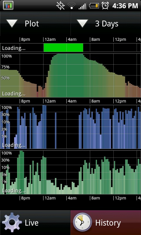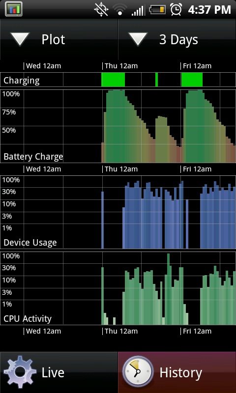 Also looks like you have several "background" data-using apps running (like facebook and email). Are you polling or using email push? If push, that's a hog as it never lets your phone truly go to sleep. I don't use facebook, but maybe it's keeping the data active too much, also. Note your CPU usage versus mine that I just posted. That's the problem; something is keeping your phone "running" at fairly high utilization. If you can determine what it is and reconfigure it to do otherwise, you're golden. Still, if it were not for that 40 minute SportyPal drain I think you'd be close to 12 hours for the drain time and if you're using all of that $10 Premium Data then I think that's pretty good