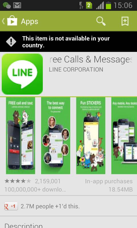 "This app is not available in your country.". Obviously geo-restricted availability. Same with iTunes store in as well, neither WhatsApp or Line are available for iOS or Android here. So one has to use same messaging app as everyone else you know uses, which to me is mainly WeChat and Skype. And those are available everywhere AFAIK.