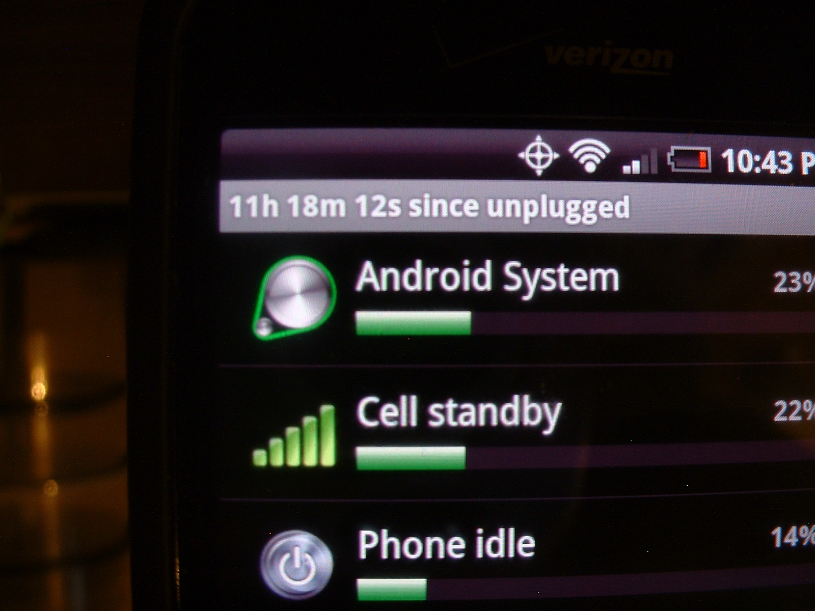 :D On day 4, stock "HTC-DI-1300" from full charge to right now 11h 18m 12s and have 13% to go. So fare today did about 10-calls, 2-hour internet, 1-hour game play, 12 texts, use shopsavvy about 15 at the store, Wi-Fi is always on but not looking for locations, Bluetooth off, GPS off. Only thing I do have on my phone to help is an auto appz killer for when my phone sleeps. When I unlock it every thing works. :D