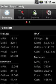 DriverDiary tracks fuel mileage, expenses and parts. The free version offers many features and is not limited like most other free vehicle tracking apps. It is ad supported and it does lack a couple features from the pro version, but is otherwise fully functional.