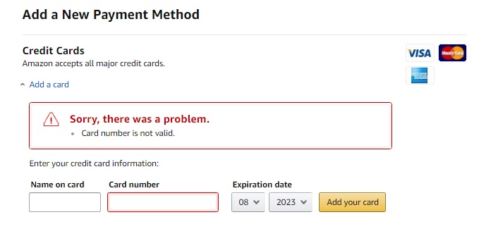 I've tried many MANY times to checkout on Amazon with my debit card and it keeps saying that card number is not valid! I know I put in I correctly. There is no option to choose between Debit or Credit, just says Credit.