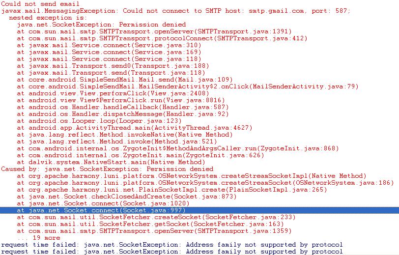 javax.mail.MessagingException: Could not connect to SMTP host: nested exception is: java.net.SocketException: Permission denied