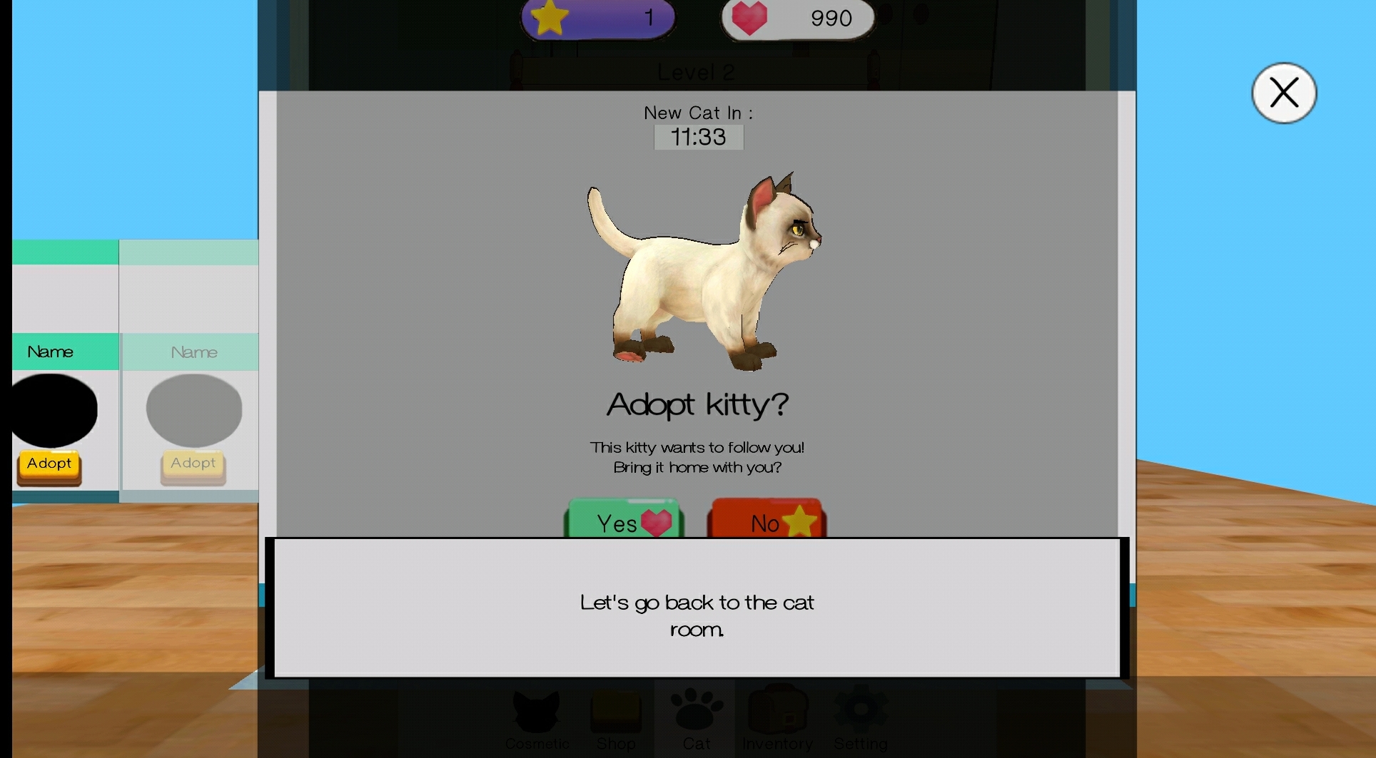 Hey there, can you show me how to adoptva kat then get back to the app? i select adopt then "yes" but cant progress from here. i am sure its silly-me