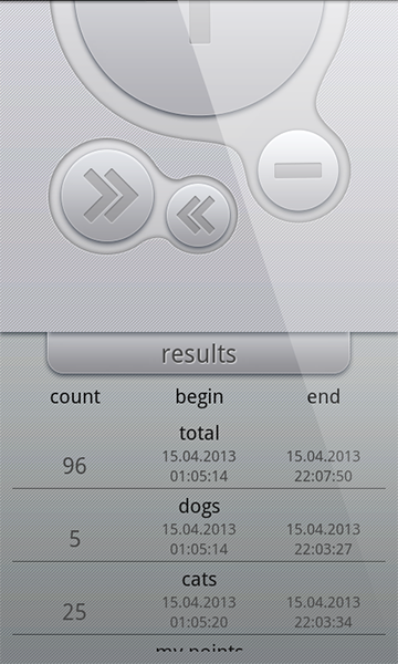 The application allows you to produce an accurate count, even distracted by other activities and store the results as long as desired (lite version, as opposed to full version, saves values of only first two counters).