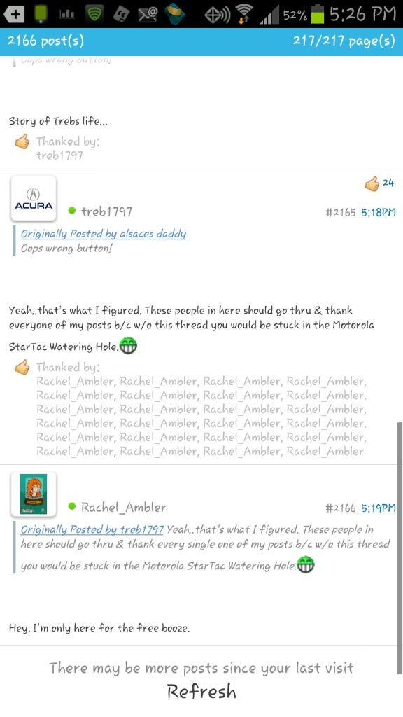 Hey guys & gals did I miss anything ? ( of course not treb, the thread sucked w/o you ). I would thank you guys for those posts that I really liked while I was out, but since you guys never hit the Thanks ( kymberlin, it's that little blue button that says Thanks on it ) button on my posts you can just forget about it. :mad::mad::mad::mad: