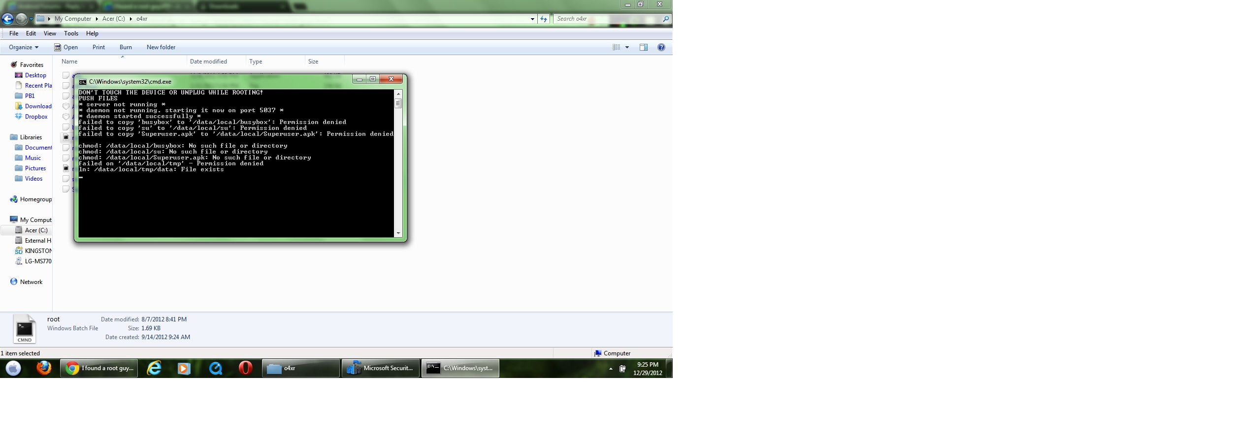 EDIT: ok, so after the errors, and the reboot, I opened the signed APK again, and double clicked root.bat, AND IT RAN! Downloading a root checker now, screenie to come.