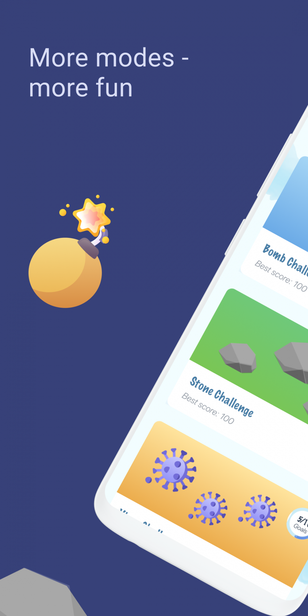In addition to the dots, there are stones on the field. Every stone object contains a countdown. The game will end when the countdown reaches zero. To get rid of the stones, throw them off from the field. The goal is to maximize the game score.