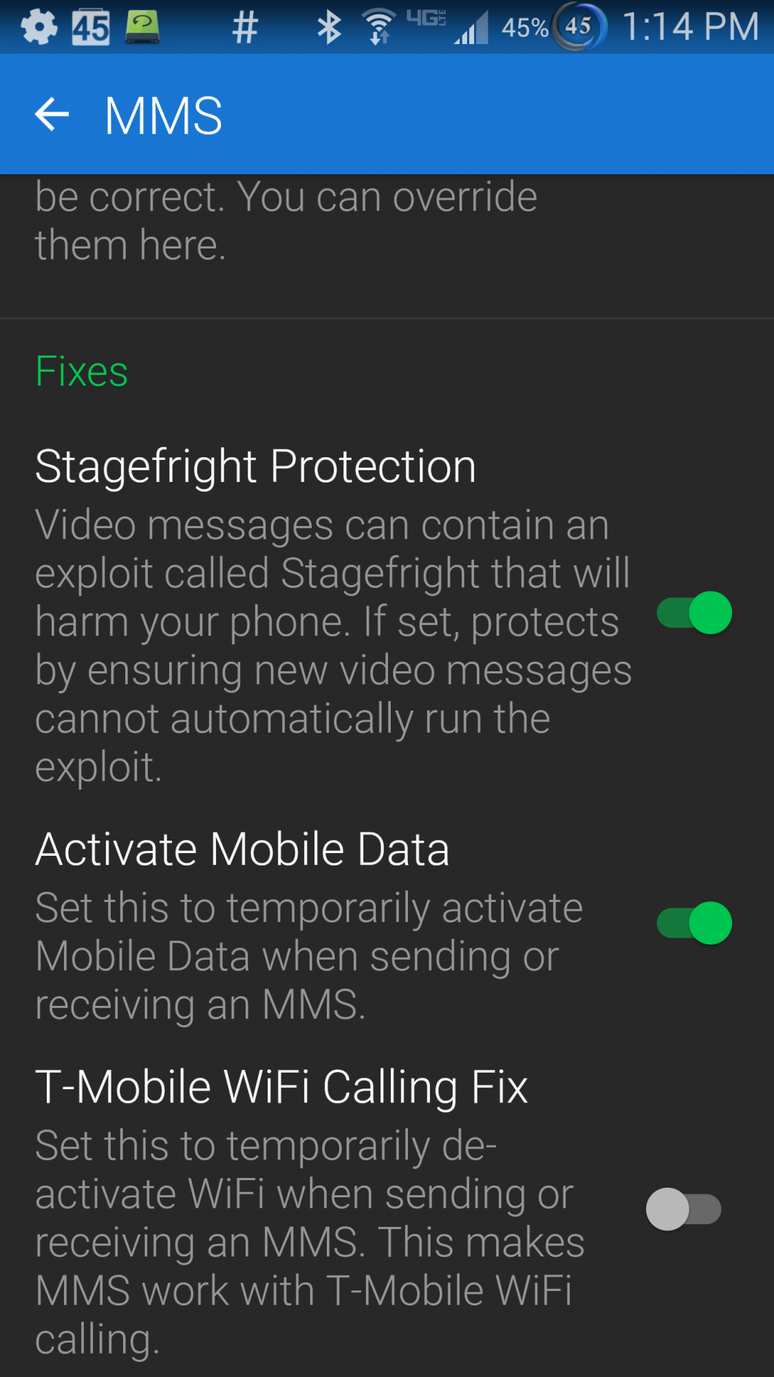Then from Googling I read a review of a text msg app (forget which one) and it said that some services require that "mobile data" must be turned on when sending text messages via Wifi. I had turned "mobile data" off on my wife's phone for testing text messaging via Wifi since her phone only has Tmobile's legacy voice only prepaid plan. So I turned "mobile data" on, on her phone.