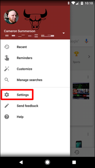 From within the Google app, tap on the three lines in the upper left corner (or just slide in from the left side. Tap “Settings.”