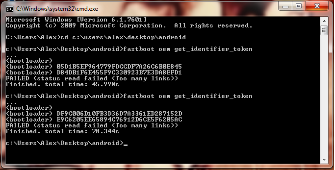 Hello guys... I need help I'm brand new to the site here... I'm trying to root my evo 4g 2.3.5 with hboot 2.18 using the htc dev method.... I have all 3 files in a folder named randroid, change directory in cmd to that folder and type fastboot oem get_identifier_token... and I get like 2 lines of code when I enter it into the dev's input box on their site it says the token is too short.... what am I doing wrong?