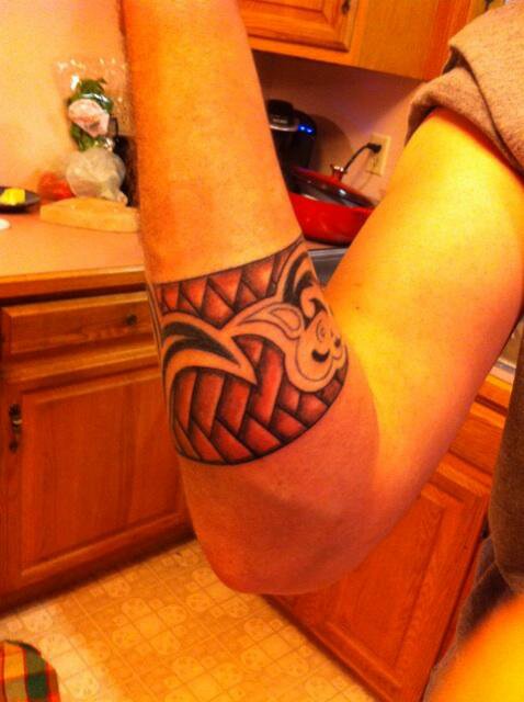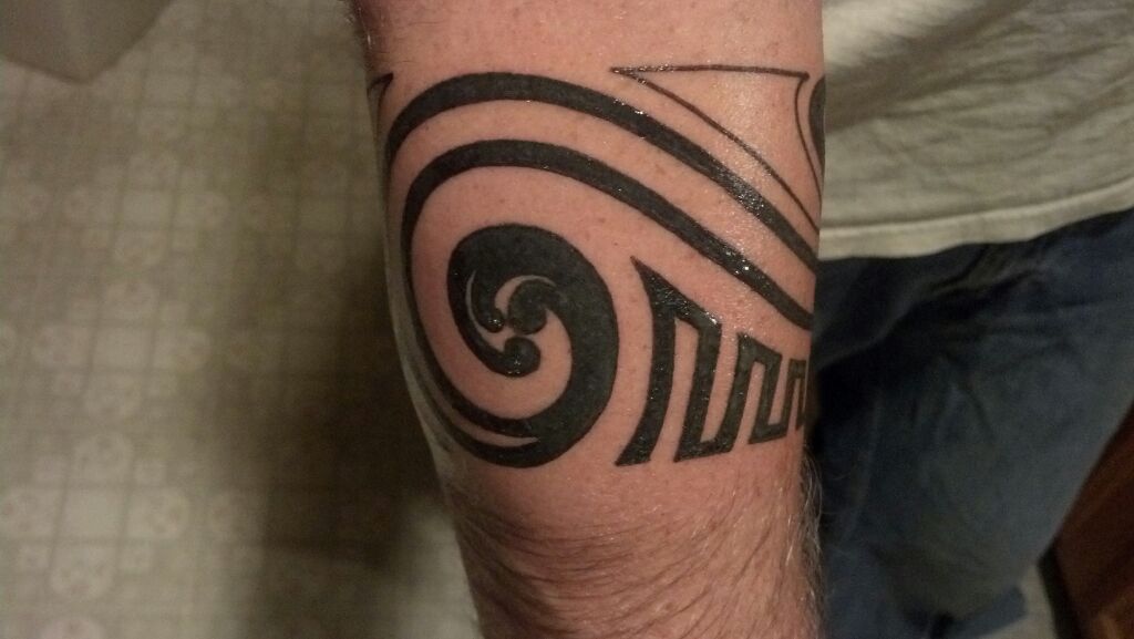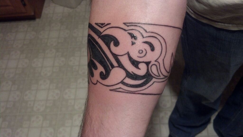 My Father wanted a Maori symbol and never got the chance to get one. This is a Manaia, which means guardian. My good friend designed it to work in a band on my forearm. I'm so happy with it. There is more to do yet, but I didn't have time to keep going during our session.