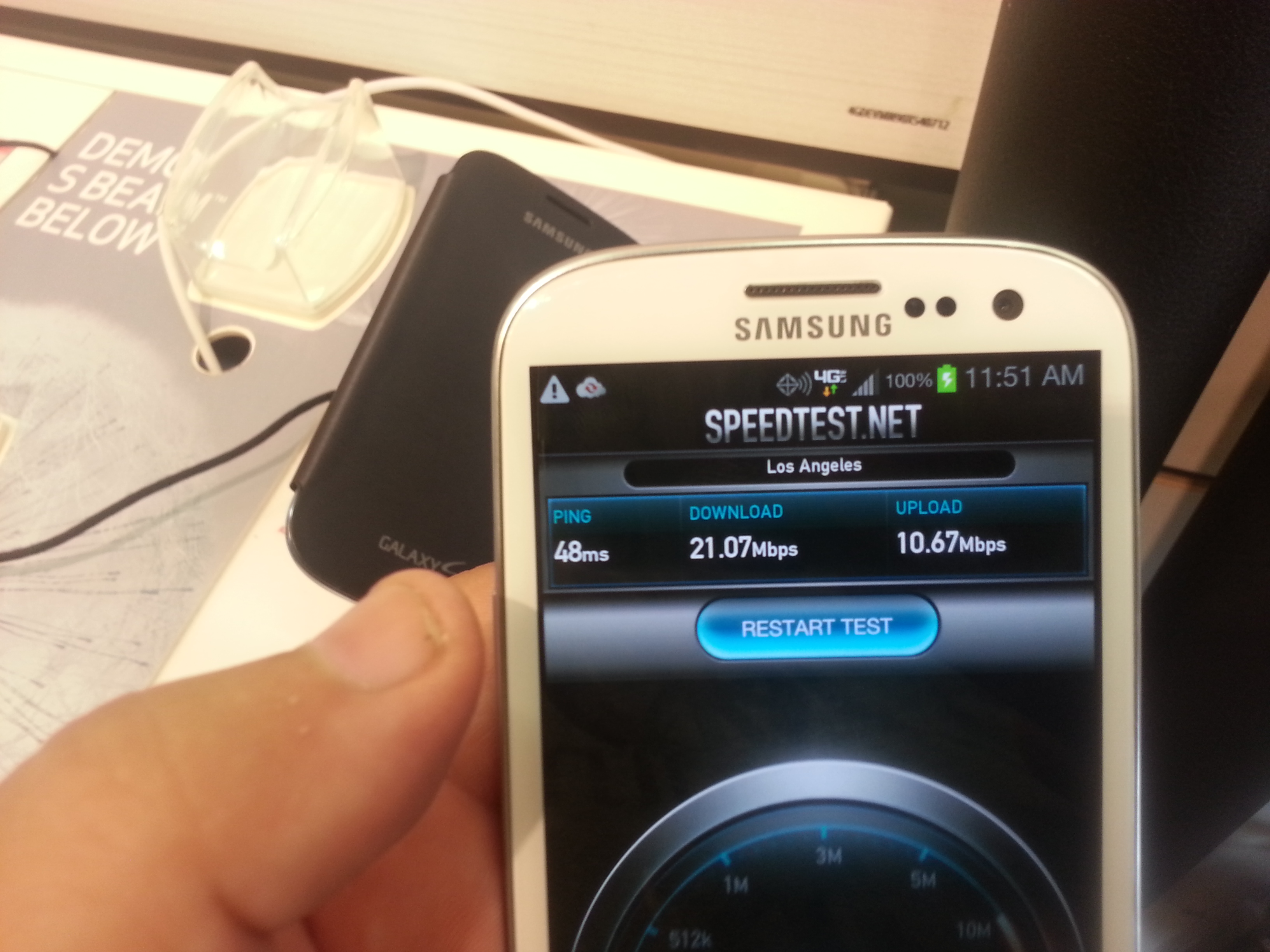 This is what the stupid iPhone 5 has done to AT&Ts LTE network! The first pic with the white SIII is from today in the Verizon store on LTE. The screenshot is from my SIII on AT&Ts LTE. Same server in LA even. This is even worse than 3G speeds, pathetic :mad: