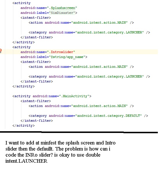 Hello Good morning , Anyone help me ? in .manifest can use? 2 .LAUCNHER intents .? I to declare the splashscreen and intro slider as .Launcher? check out my code ..