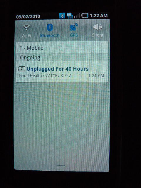 I used the phone as I normally would have for the last couple of days. As before with the test of the Ebay battery, I used the phone to talk on as well as send and receive about a dozen text messages. I would estimate total talk time of around 30 minutes. I also used some apps, but none of the battery killing ones such as Google Maps, Earth, etc. Screen timeout is set to 2 minutes and brightness is set to 100%. This automatically drops when the battery hits 29% though. I run the City at night live wallpaper. I don't run any task killers. I got a screenshot this time as well.