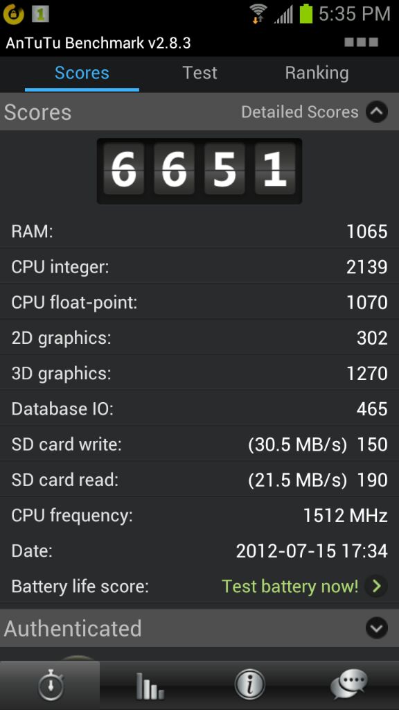 T tilk23 Member Jul 15, 2012 #2 My score is pretty much the same except for the sd card. What card are you using? I get 7mb write and 22 read on a Patriot LX 16gb class 10