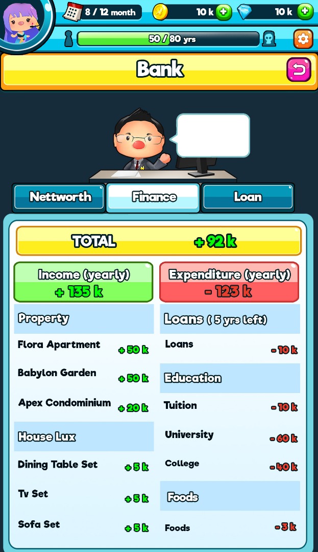 NETTWORTH is a game where you play as yourself, on a path to success, your resource is time, and money, how you spend it is up to you. Take a bank loan to kick start your studies or start working immediately as a dishwasher to save up for your studies. In NETTWORTH, we aim to educate players to a better financial management.
