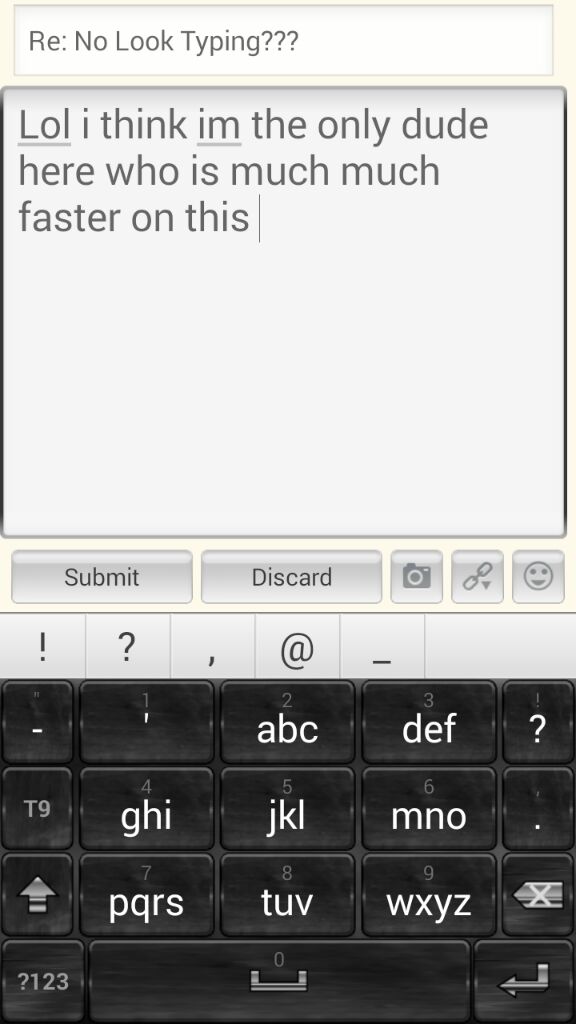 First I admit that I am one of those "obsessive" people that like doing anything they do as well as possible! So I have decided that I want to be a very fast typer on my phone when I am texting. So much in fact, that I paid for an app. that is actually a typing "course," for the phone, and one thing they keep stressing over and over again is that in order to type faster you should NOT look at the keyboard as you type, but rather what you are actually typing. What I fail to see is exactly why looking at the keys slows you down, and at this juncture I can type twice as fast looking at the keys than I can by not! So before I started to practice "no look" typing, what I wanted to know is how many of YOU fast typers on the forum actually do type without looking at the keys? I'm really slow typing without looking, and if this step isn't going to be beneficial I'd just as soon skip it and move on with the course!
