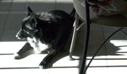 Queenie, with her [feline] brother Ringo watching, as she ate her dinner. She would only eat lying down on the floor. :confused: :D
