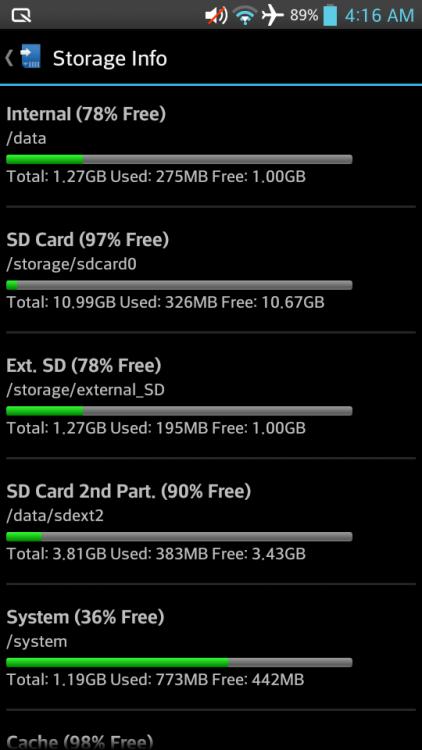 My MetroPCS F6 is rooted, CWM recovery installed along with internal/external storage swapped and link2sd plus managed. The 16gb microsd is partitioned with 11gb/4gb (fat32/ext2) via Mini Partition. Plenty of space in all three locations, see attached.