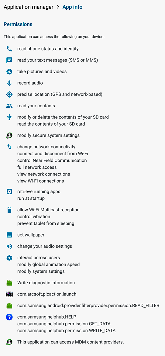 I just checked a few devices ... LG G6, LeEco LE2, Nexus 6 and a Galaxy Note 10.1. All has only permission for the camera, the mic, storage and location EXCEPT the Note. That had the keys to the kingdom (almost every permission imaginable ... that's a lot Samsung. :p )