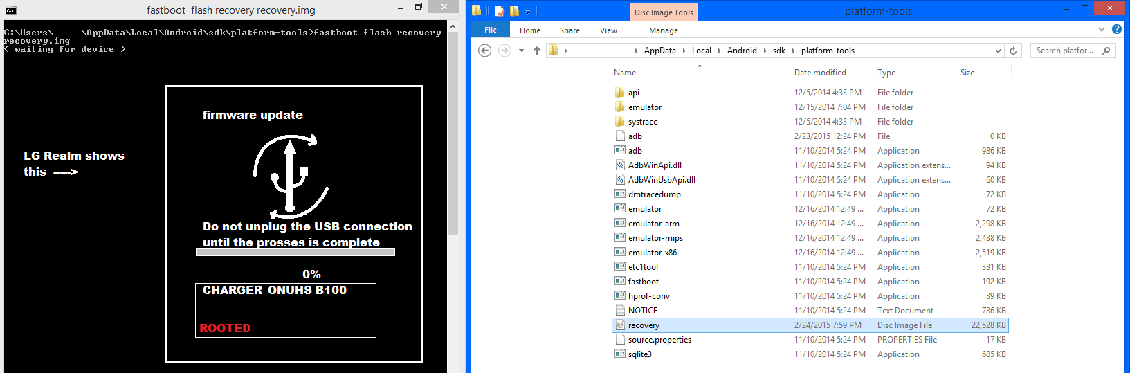 Keep in mind, when rebooting from recovery, it will ask you to do 2 things, select no for the first option and select yes for fix root or you will lose your root. To boot to recovery power off device, power on the device, and wait until it gets to the dim LG logo and try to interrupt the long vibration by pressing volume down a few times, if done correctly, your phone will stop the first boot and start another one that boots you to recovery. Timing is key so it might take a few tries