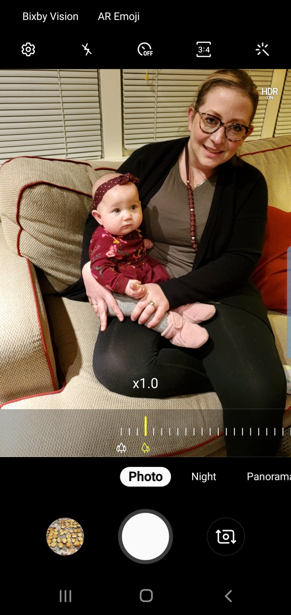 I have a new Samsung Galaxy S10e phone (upgrade from S7). I have read several tutorials about using it and also about using the camera. However, I can't figure this issue out: several times I have been trying to take a photo and all that happens is that the display screen shows a line with markers and the number 1.0. If I press the take-photo button again, the line just flashes. This is extremely annoying. Other times the photo button simply takes a photo. I make no changes to any settings. The screen optimizer is on and the two trees icon is active.