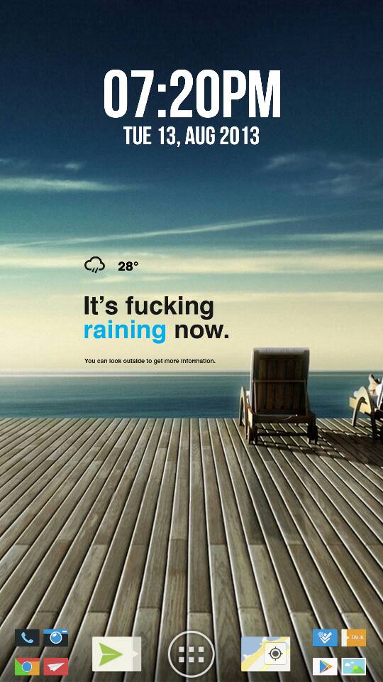 the clock/weather widget is beautiful widgets with what i think was the Jelly Bean Slim skin and it lets you hide the background, i believe that is what i did, its changed since then. and the wallpaper i got from the Zedge app, i believe it was one of the top downloaded so it should be easy to findThe first pic is excellent either the clock/weather widget, or the wall paper. Can you please share both, od from where did you get them?