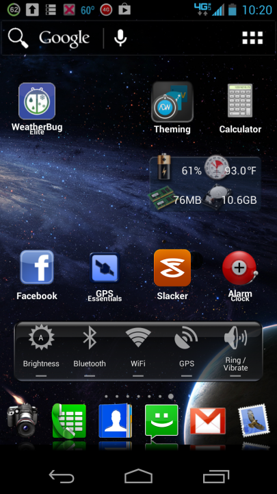 I haven't posted home screens in awhile so here's my latest. Very similar to the last one with just some added widgets. I only use three screens with all apps in common folders and then a bunch of widgets. I love the one in the lower left corner called Brightness Level Disc. Great widget for quick screen brightness changes. Still using Nova Prime launcher with cube transitions and HD Widgets. Just rooted so experimenting with that a bit.