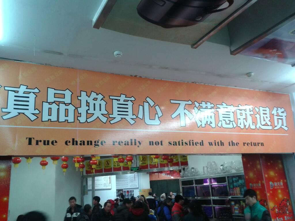 I spotted it in the supermarket. It's a slogan about being able to return and change anything you're dissatisfied with. TBH I don't think it's Google or Baidu translate, it's just classic Chinglish. A literal word for word translation of Chinese words into English with no attention to grammar.