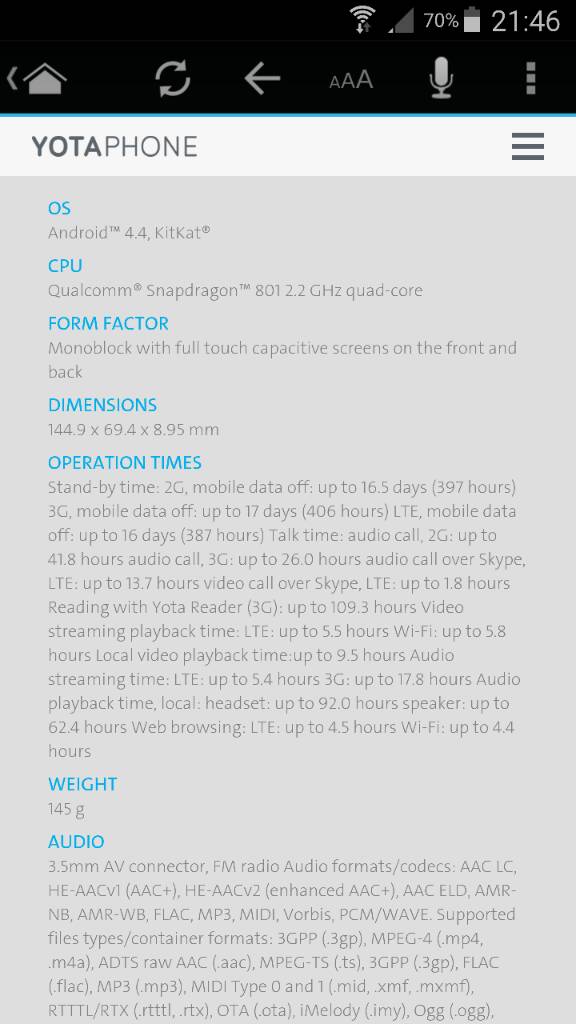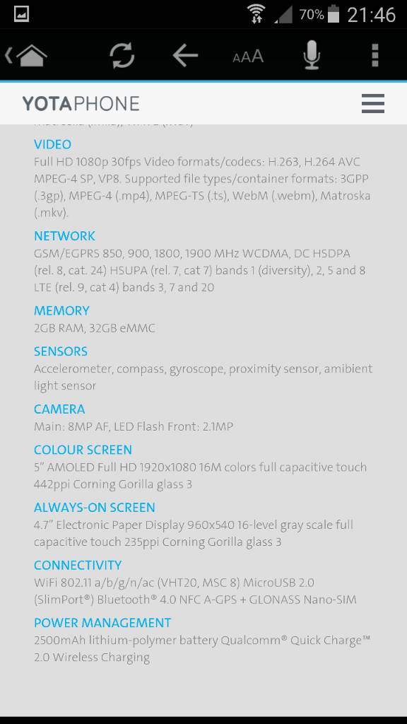 Snapdragon 801, 2 GB RAM, stock Lollipop, 5" 1080p front display and qHD e-paper b&w rear display.