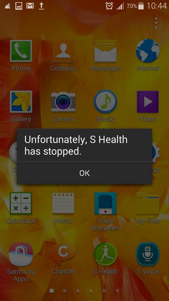 [*]I just purchased my brand new Samsung Galaxy S5. I have used the cool features of this new model and was so happy with it. After some updates, I opened (S Health) to try my blood pressure, but it says (Unfortunately, S Health has stopped) as in the attached picture).
