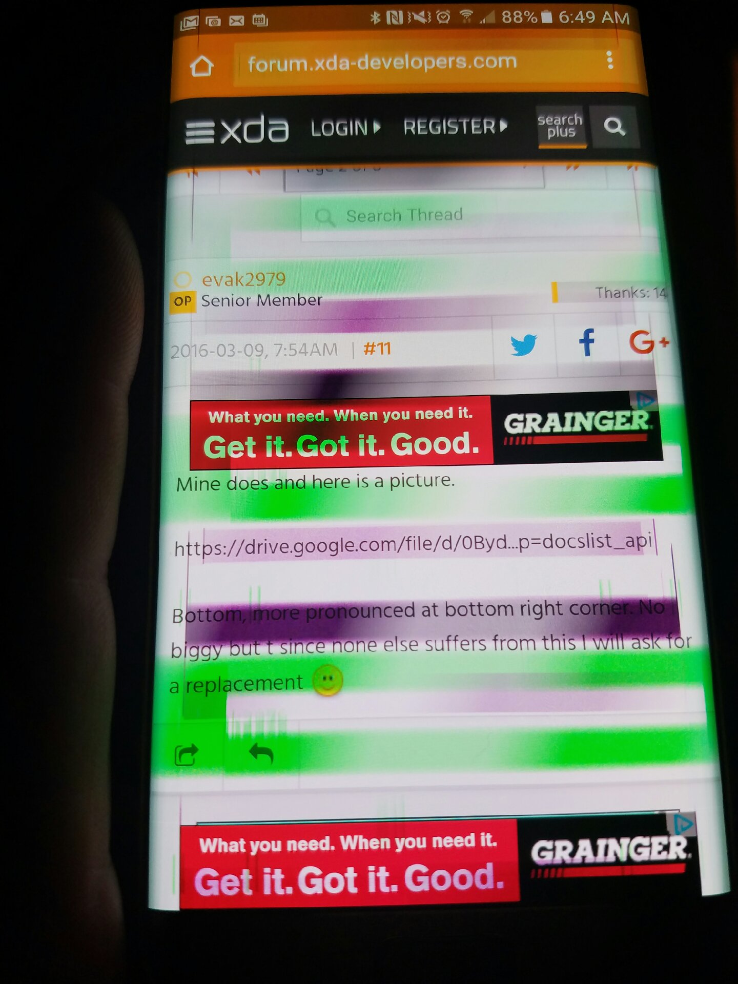 Last night my wife went to bed and her phone was working fine. This morning she woke up to a weird color distortion, and pixelation on her screen, that is present at all times, but gets worse with Warm color icons and fast scrolling.