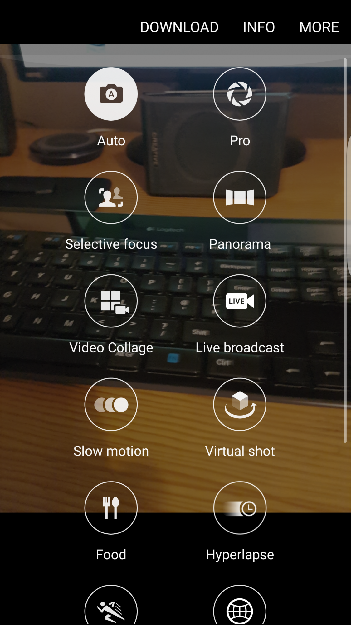 I've pressed mode and the only option at the top is INFO. No download option. Just come from a HTC m9 and feel like I'm missing something obvious.You have to download other modes/options from Samsung. Tap mode, then download at the top whilst in the camera.