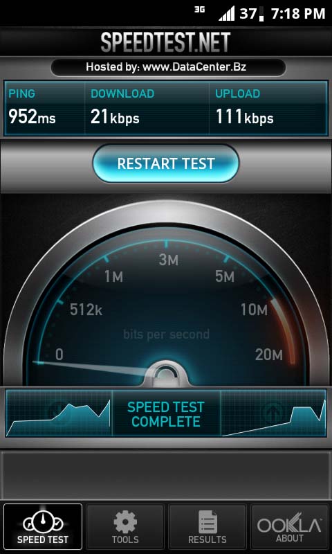 200kbps down and 100kbps up just now at home with good reception, it has never reached over 1mbps in my testing at various locations, good thing I am mostly on wifi or else I could not deal with this. An iPhone sitting next to it just got 3.2mbps down on AT&T with less reception, guess which phone we use when traveling and tethering, I wonder if my sprint phone is capped because it is on a corporate resale plan.