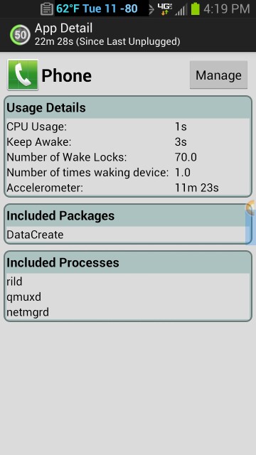 But the GSam stats show the phone being held awake 4 hours out of the 8 hours, which is bad. Apparently the GSam stats were taken before the CPU Spy app was even started.