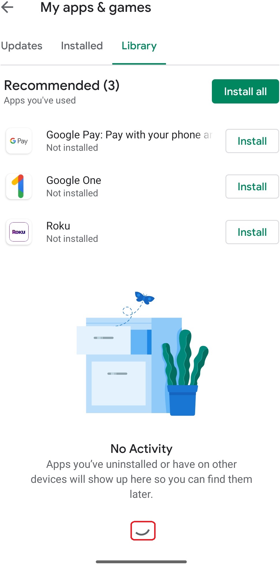 Also, in my Library tab, the uninstalled apps: Google Pay, Google One & Roku, didn't have an 'X' by them. Don't know why.