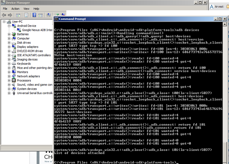 I then toggled on the "adb_trace=all" per the three commands in post #2 of xda's driver troubles thread, which spit out the jazz shown in the attached pic, where my device manager line is also visable off to the left.