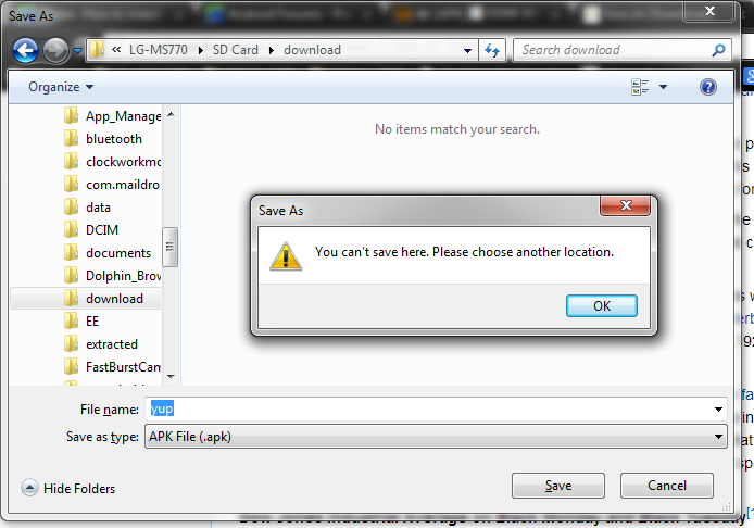C cubone Well-Known Member Nov 13, 2012 #1 Ever since i have gotten my motion, I have not been able to directly download files from Chrome to the internal or the external sd card. Has this happened to anyone else? And does anyone know why? Attachments cannot_save_as.jpg 189.5 KB · Views: 197